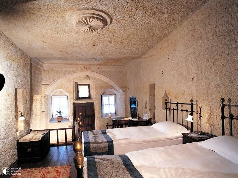 Один из пещерных отелей - Yunak Evleri («Священный дом»). Отель состоит из 30 номеров-пещер, датируемых 5–6 веками нашей эры и греческого особняка 19 века. Каждый номер в пещере оформлен антиквариатом Османской эпохи, личным спа-салоном и патио.