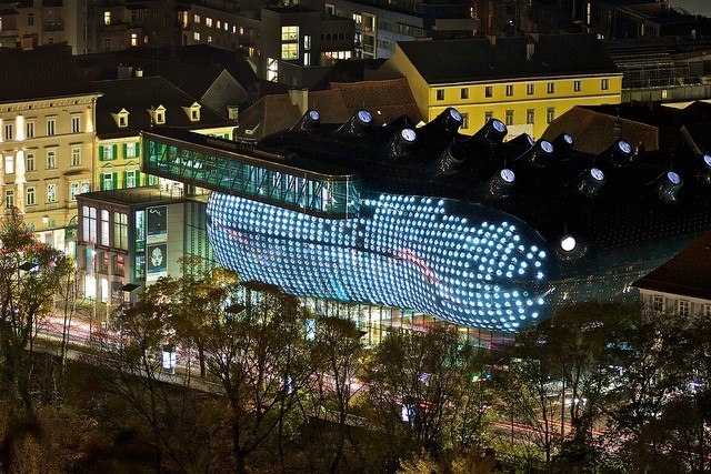 Но сами жители Гратца окрестили новичка доброжелательным инопланетянином. Кунстхаус отлично видно со смотровой площадки часовой башни, с горы Шлоссберг.