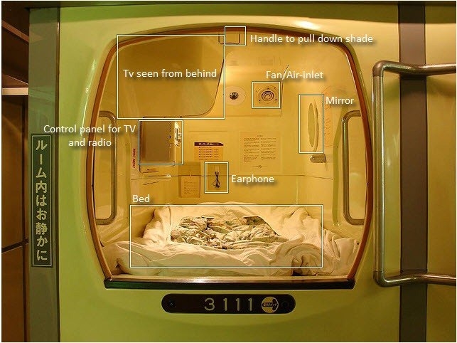 Капсульные отели — уникальная форма отелей, специально созданных для японцев, которые слишком заняты на работе, чтоб пойти домой на обед. Отель состоит из отдельных блоков-капсул небольшого размера, где как раз достаточно места для того, чтоб лечь в полный рост и поспать