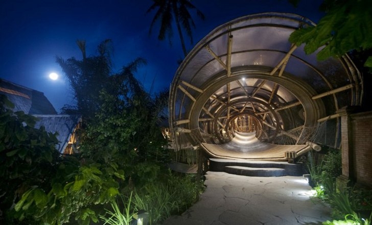 6-этажная постройка площадью 750 квадратных метров напоминает распустившиеся цветки лотоса. Вся структура построена вокруг центральной вертикальной 20-метровой опоры. В доме оборудовано 4 спальни, просторная гостиная, столовая, кухня, пространства для отдыха. Интересен тот факт, что практически нигде (за исключением спален) нет наружных стен. От непогоды внутреннее пространство защищают низкие навесы. Вся мебель также выполнена из бамбука по эскизам дизайнера Elora Hardy. Вход на виллу осуществляется через 15-метровый тоннель.