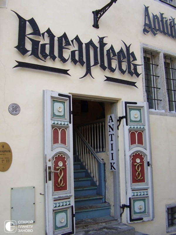 Вторым по значимости зданием на Ратушной площади является конечно старинная аптека магистрата. Найти ее можно на противоположной от Ратуши стороне площади. Сделать это несложно — на стене вы сразу увидите указатель.