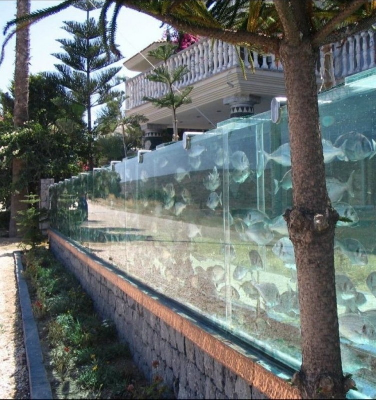 Житель турецкого города Измир построил около своего дома необычный забор. Он представляет собой заполненный морской водой аквариум, длина которого составляет 50 метров. Внутри грандиозного сооружения плавают сотни различных рыб и несколько осьминогов. Замена воды в заборе-аквариуме осуществляется непрерывным циклом прямо из моря. Необычное ограждение уже успело стать местной достопримечательностью.