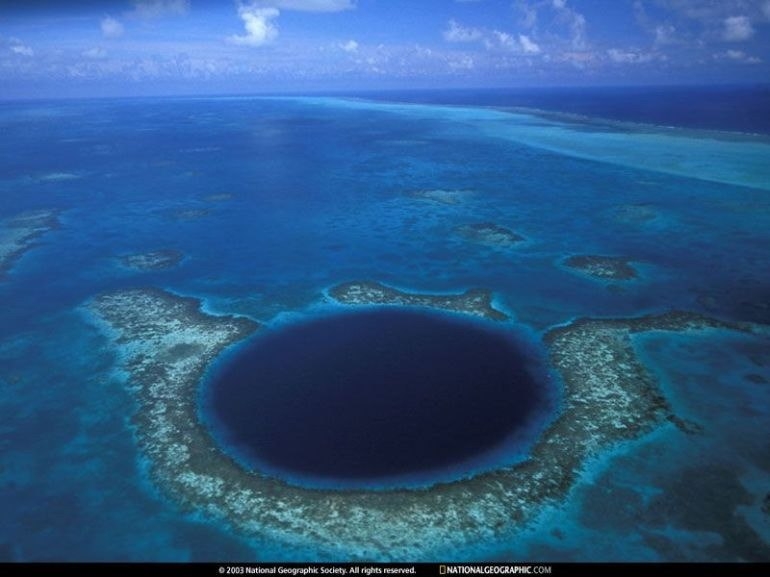 Большая голубая дыра - одно из геологических чудес вблизи полуострова Юкатан (территория государства Белиз в Центральной Америке), представляющее собой круглую воронку диаметром 305 м и 120 м в глубину.